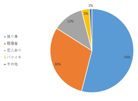 独り身が一番多く54%で、既婚者が何と30%!恋人ありは12%。未亡人またはバツ有が3%。
