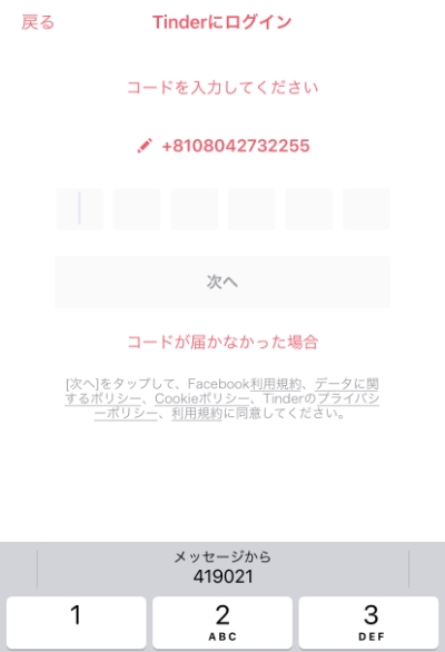 アプリを起動する→ 「+81」の隣にハイフンなしで電話番号を入力→ SMS(ショートメッセージ)にログインコードが届く→ Tinderの画面に届いた6桁のログインコードを入力→ メールアドレス・パスワード・名前・生年月日・性別を入力→ 写真をアップロードする→登録完了!